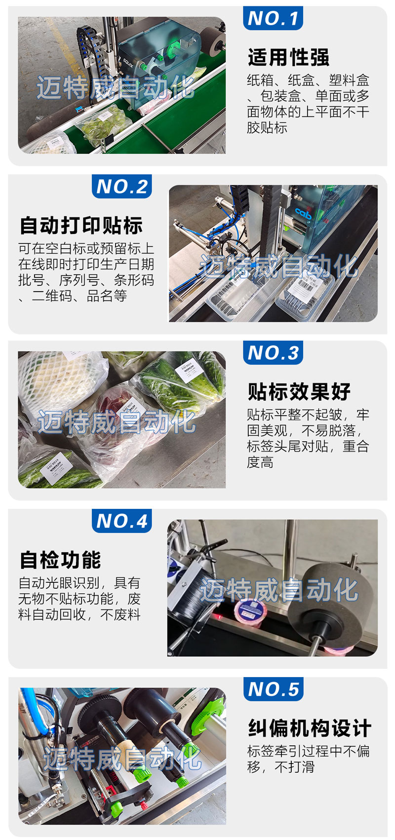 該設(shè)備適用于瓶子、盒子、成型包、包裝箱等上平面的打印和貼標(biāo)。可在空白標(biāo)或預(yù)留標(biāo)上在線即時(shí)打印生產(chǎn)日期批號、序列號、條形碼、二維碼、品名、專銷區(qū)等預(yù)設(shè)內(nèi)容并完成同步貼標(biāo)。