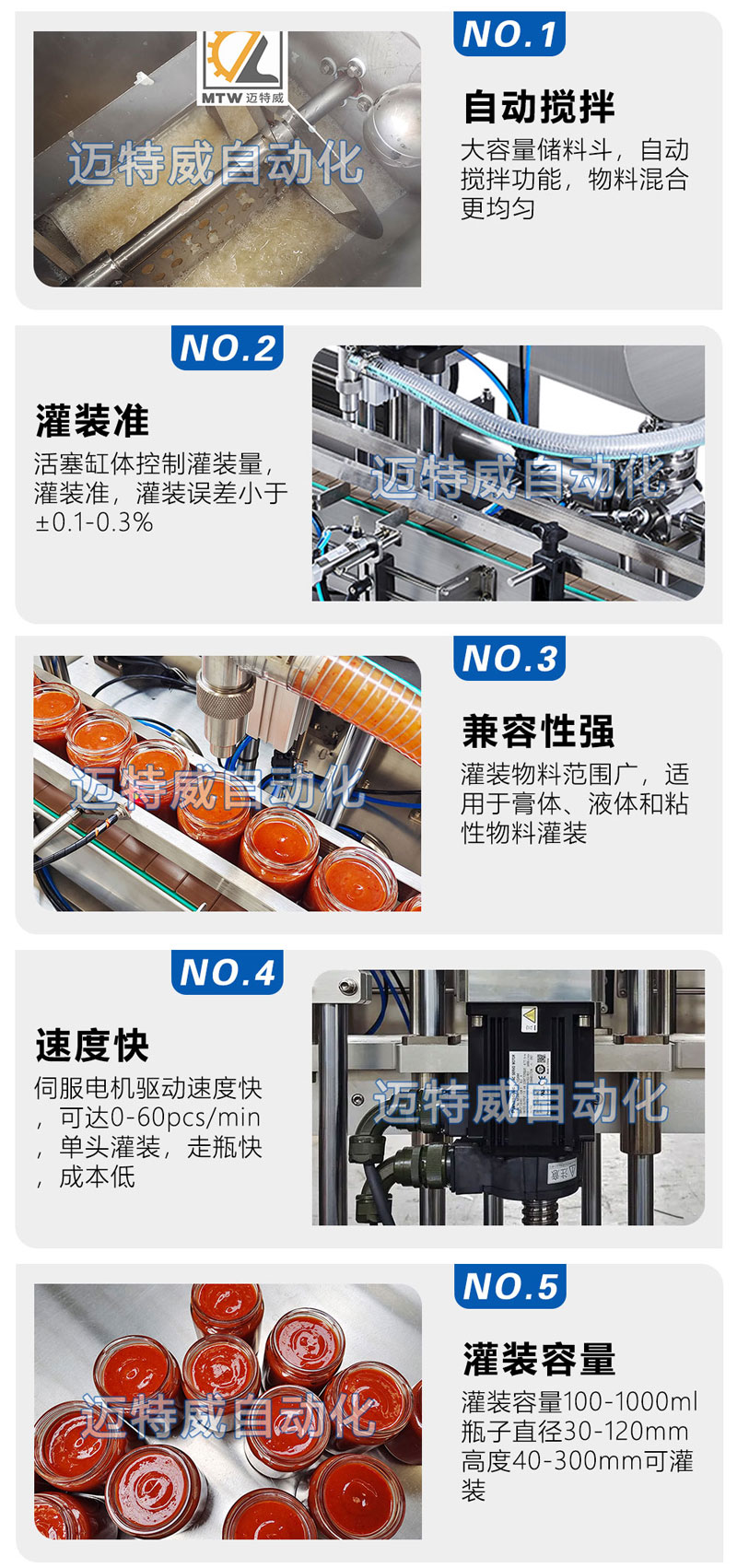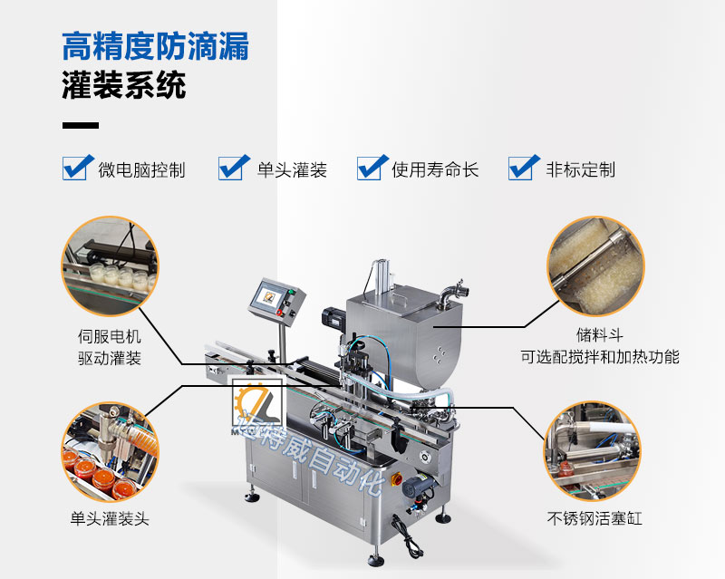 單頭伺服灌裝機采用伺服活塞定量灌裝,單頭灌裝,設備投入少,走瓶速度快,效率高,灌裝容量100-1000ml,適用于醬料、膏體、液體和粘性物料灌裝。