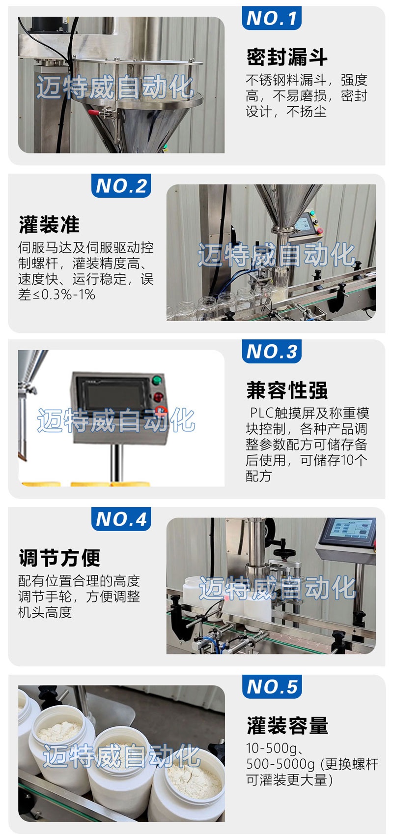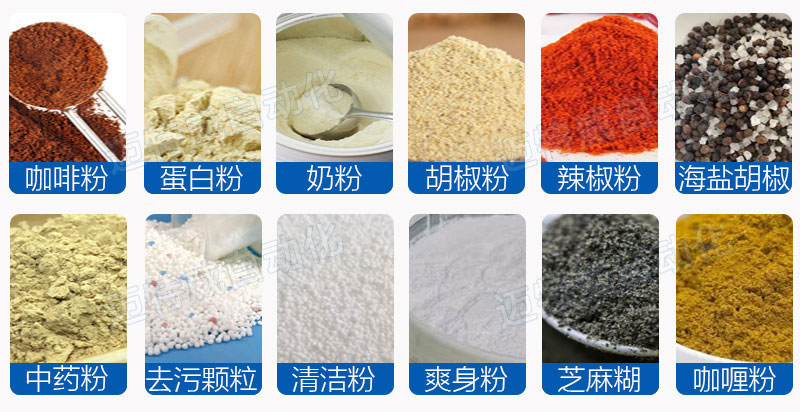 適用于包裝粉末、小顆粒藥品、奶粉、獸藥、調(diào)味品、粉粒狀添加劑、葡萄糖、固體飲料、爽身粉、農(nóng)藥等瓶裝、聽裝及罐裝產(chǎn)品的自動(dòng)定量灌裝。灌裝容量10-500 g、500-5000g (更換螺桿可灌裝更大量)。