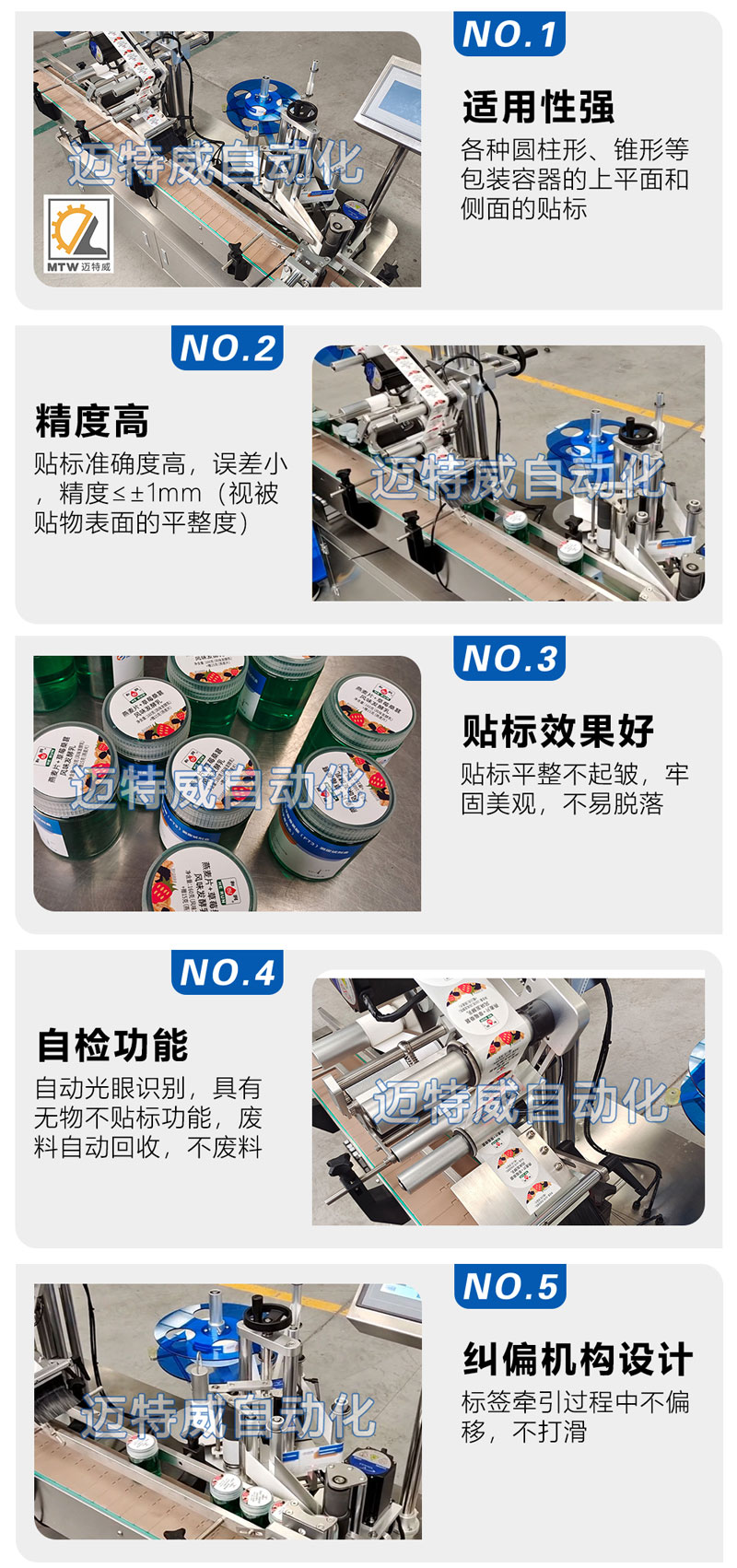 應用于各種圓柱形、錐形等包裝容器的上平面和側面的貼標,如塑料瓶、玻璃瓶、塑料罐、紙罐等,通過加定位光電,可以實現2張標簽定位貼標。可單機或在線使用,能同時對被貼物的上平面、側面進行貼標;實現與包裝機、噴碼機、裝箱機等組成無人化聯動線一體化生產。