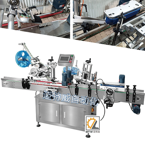 SL-DR全自動錐形瓶上平面+側面貼標機為特制機器,共有兩個貼標頭:一個貼標頭在頂部,另一個貼標頭在側面,它可以給瓶子、罐子貼上2張標簽,一張貼在頂部,另一張貼在側面。可實現頂標和側標的定位貼標。