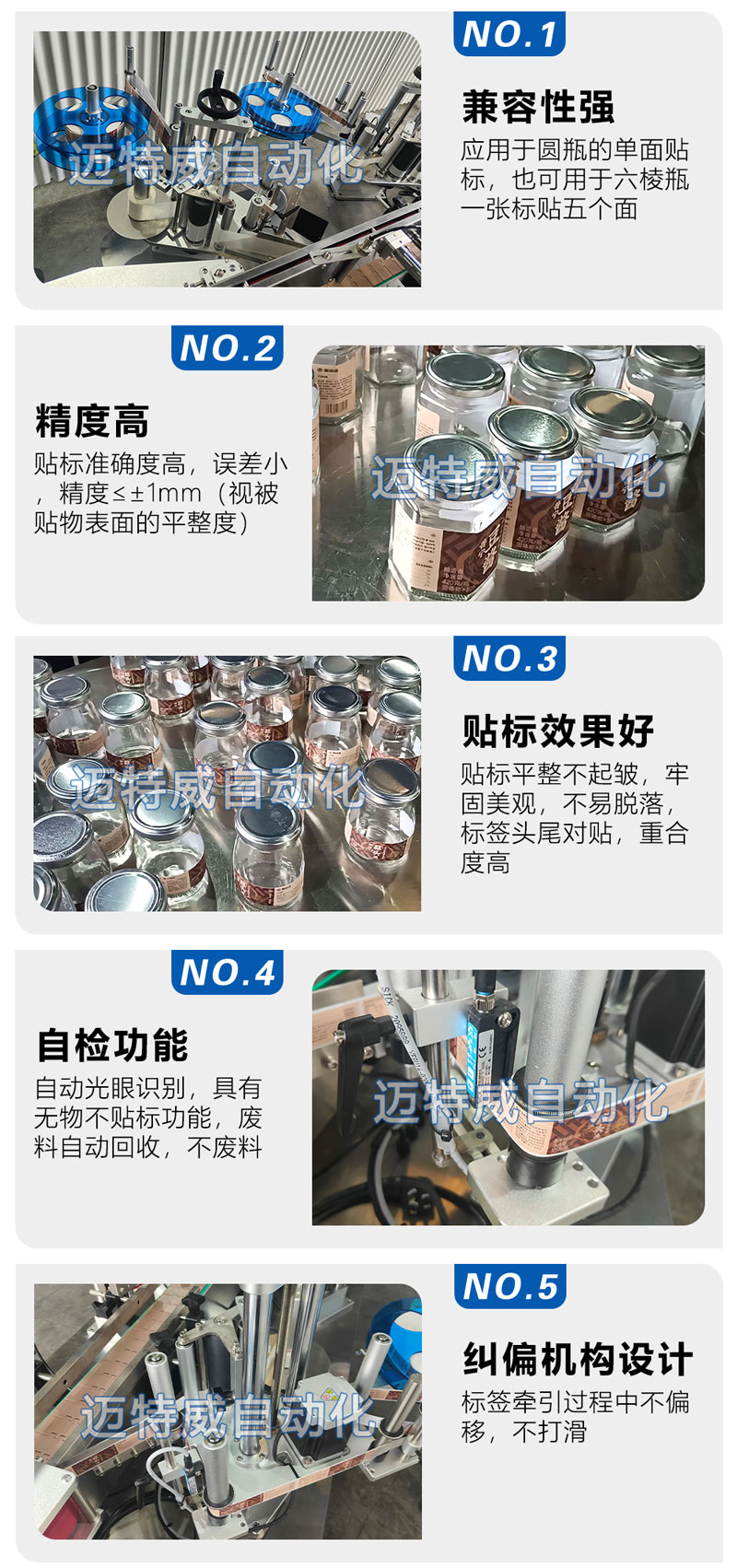 這款單面貼標機針對客戶需求設計,可應用于圓瓶的單面貼標,也可用于六棱瓶一張標貼五個面。