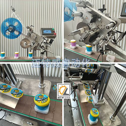 這款平面貼標(biāo)機(jī)是針對這種特殊瓶設(shè)計(jì)定制的,輸送帶上加定位模具,固定產(chǎn)品,平面貼標(biāo),精度更高。