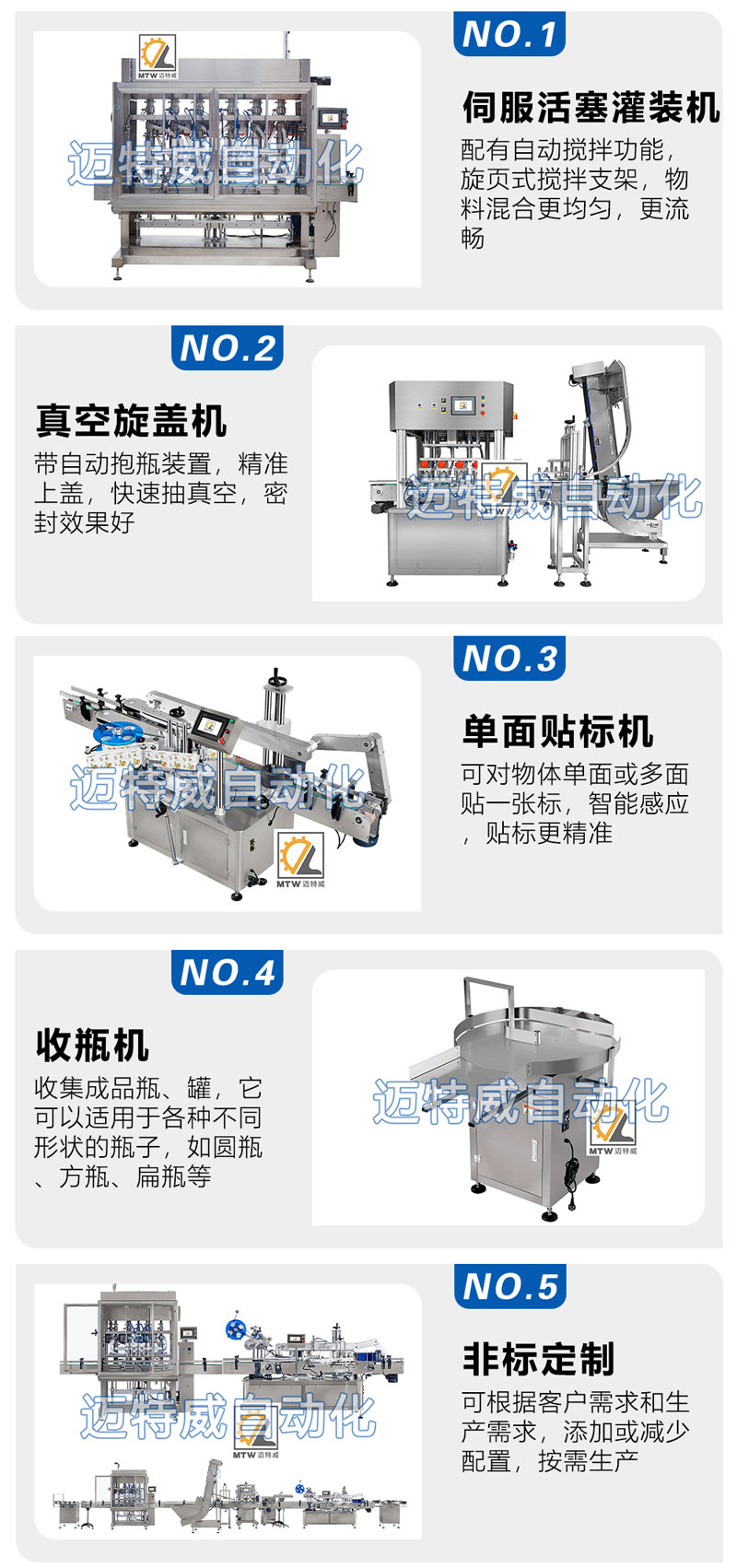 醬料灌裝生產線:伺服活塞灌裝機+真空旋蓋機+方瓶單面貼標機+收瓶機