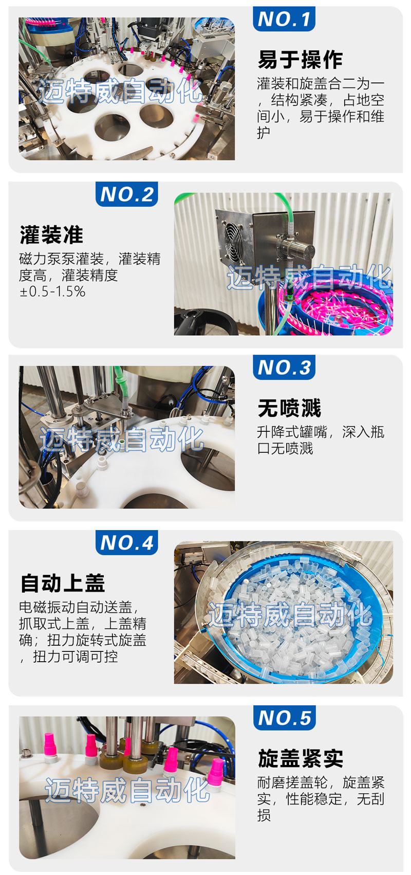 ● 采用高精度磁力泵泵定量灌裝,電磁振動自動送蓋,伺服驅動旋蓋,具有無瓶不灌裝的功能;