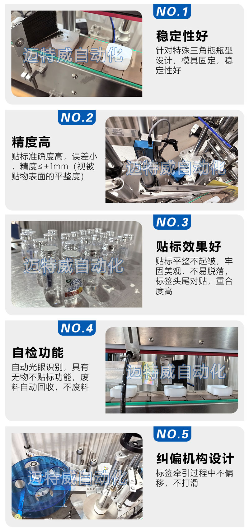 主要針對三角瓶特殊瓶型設計,設置固定模具,穩固瓶身,可單面或多面貼一張標。