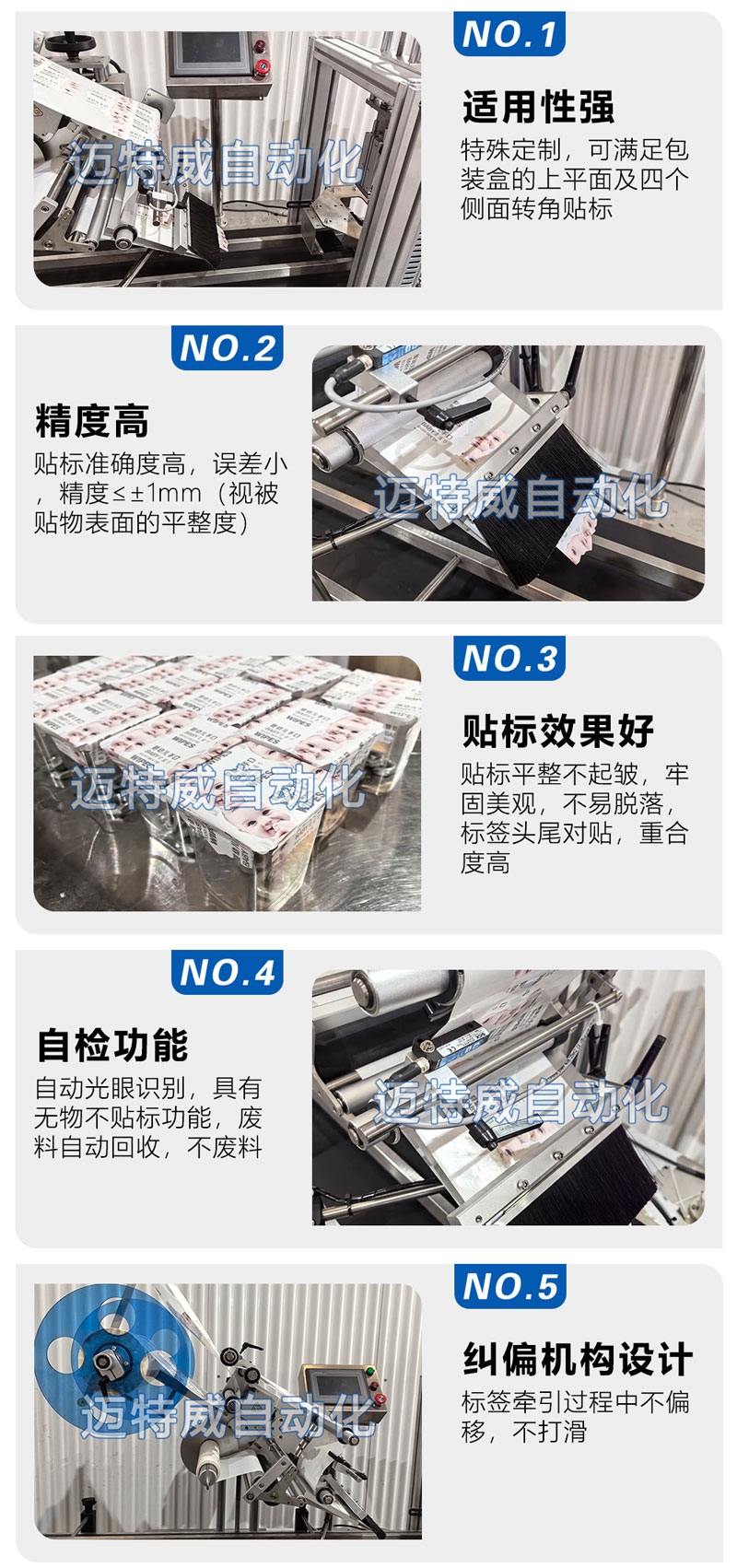 這款平面貼標機主要是針對包裝盒上平面+四側(cè)轉(zhuǎn)角貼標,精度更高。