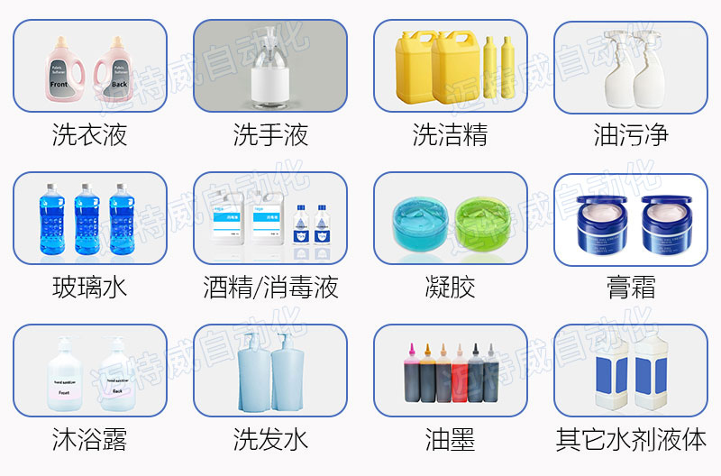應用范圍:洗衣液/洗潔精灌裝機適用于各種膏霜、啫喱、凝膠類等日化產品自動灌裝, 如洗衣液,洗手液,化妝品,洗潔精,油污凈,洗滌劑,清潔劑,洗發水,沐浴露,精華液,面霜,化妝品等。