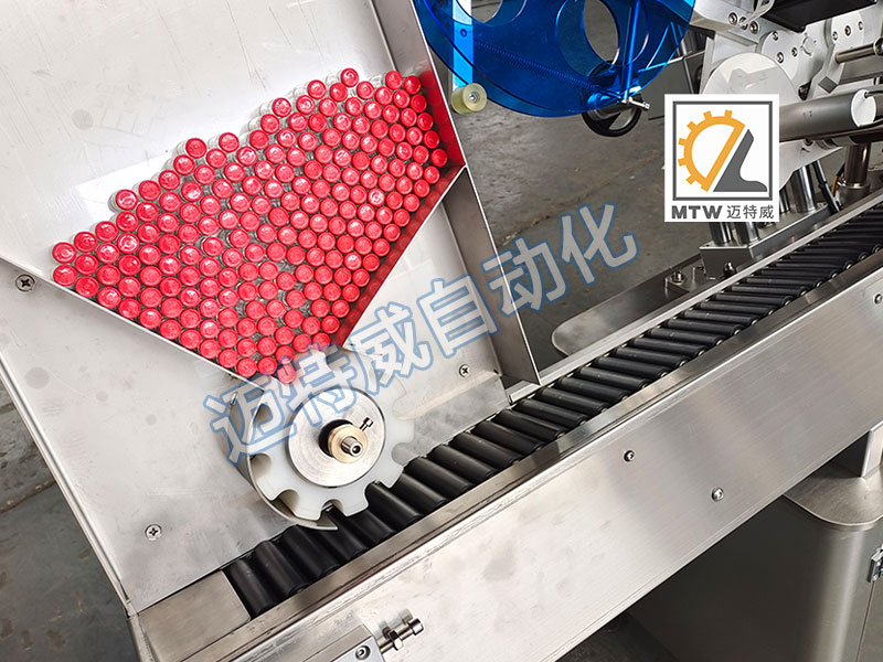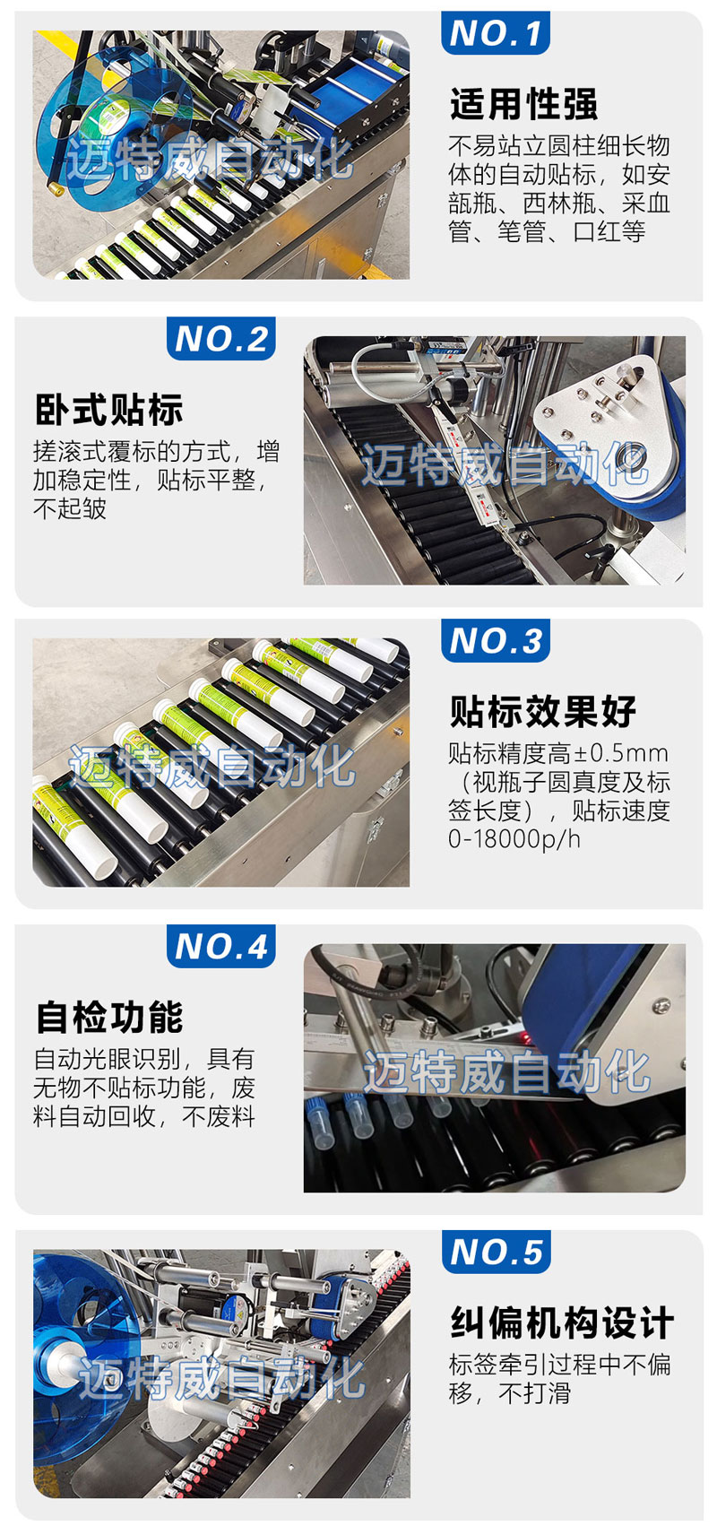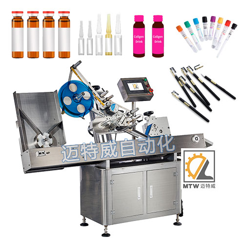 臥式圓瓶貼標機應用于醫藥、日化、食品、文具、電池等行業不易站立圓柱細長物體的自動貼標,如采樣管、試劑、安瓿瓶、西林瓶、采血管、泡騰片瓶、圓形火腿腸、唇膏、筆桿等。還可以根據生產需求在本機上配備自動裝盒機等。