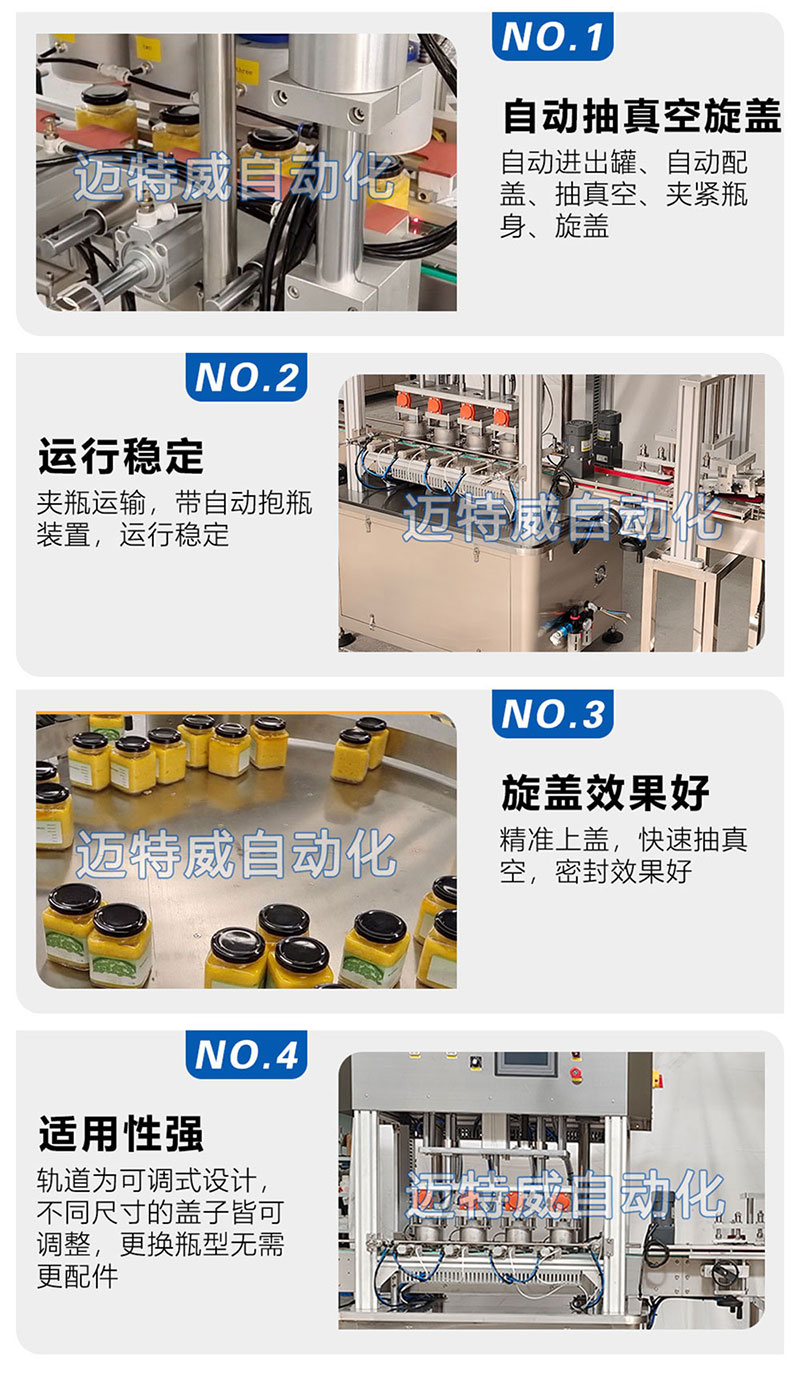真空旋蓋機應用于調味品、罐頭、蜂蜜、泡菜等行業的玻璃瓶馬口鐵蓋真空旋蓋。